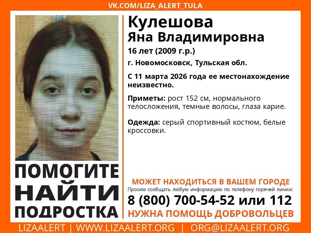 Волонтёры поисково-спасательного отряда «ЛизаАлерт» начали поиски 16-летней жительницы Новомосковска Яны Владимировны Кулешовой. Девушка пропала 11 марта 2026 года, и с тех пор о ней нет никаких сведений.
