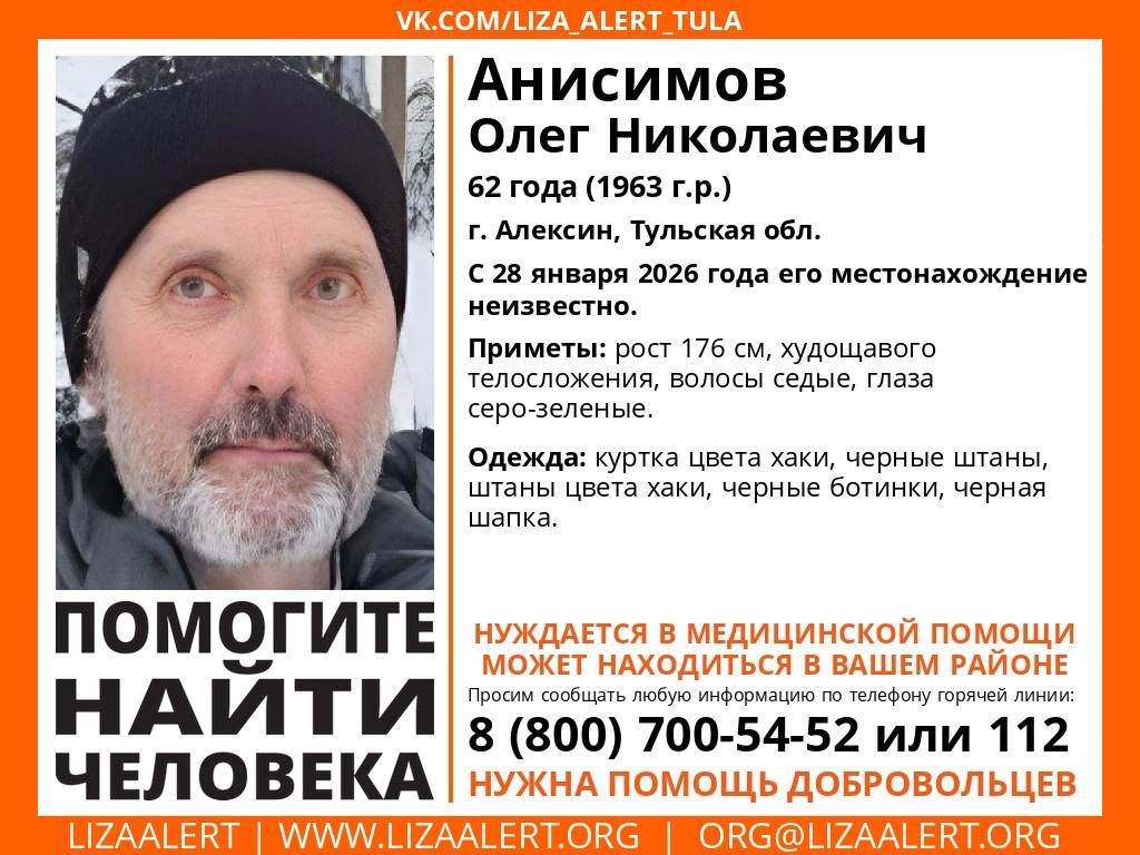 Полиция и добровольцы поисково-спасательного отряда «Лиза Алерт» с 28 января разыскивают в Алексине Тульской области 62-летнего Олега Анисимова.