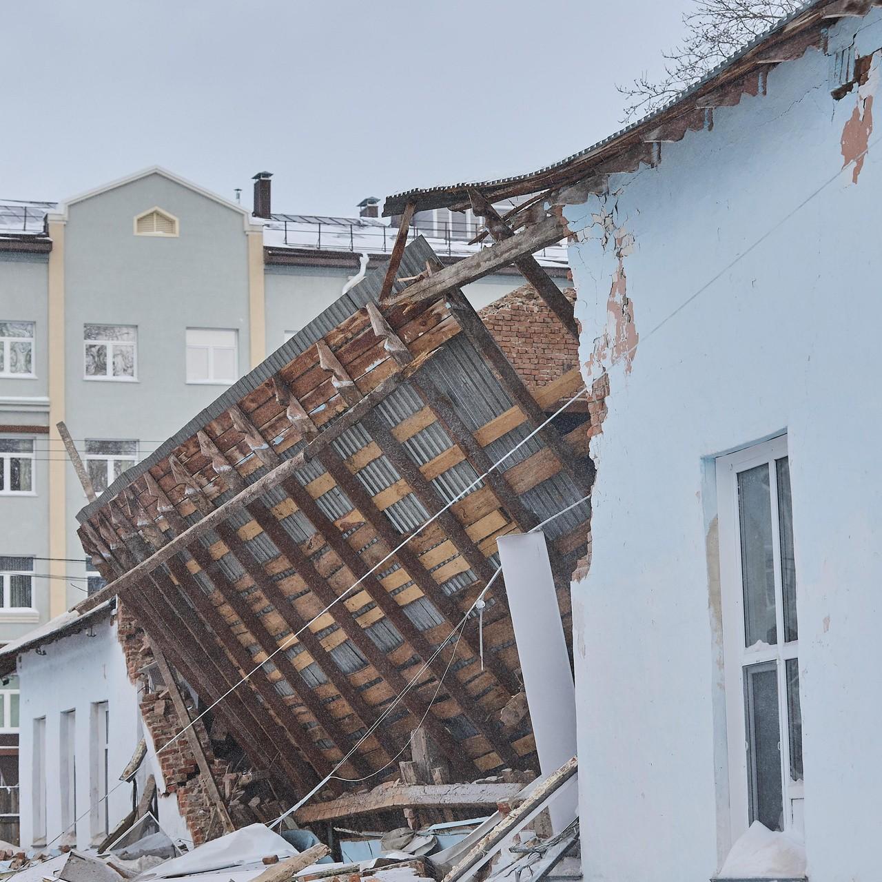 Из-за этого несущие конструкции прогнили, а тяжесть снежного покрова завершила процесс разрушения. Крыша рухнула на тротуар, полностью перегородив пешеходную зону. На момент обвала рядом никого не было, поэтому жертв и пострадавших удалось избежать.