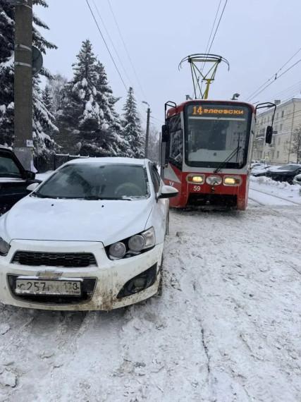 На фотографии запечатлён один из случаев, когда автомобиль заблокировал трамвайные пути.