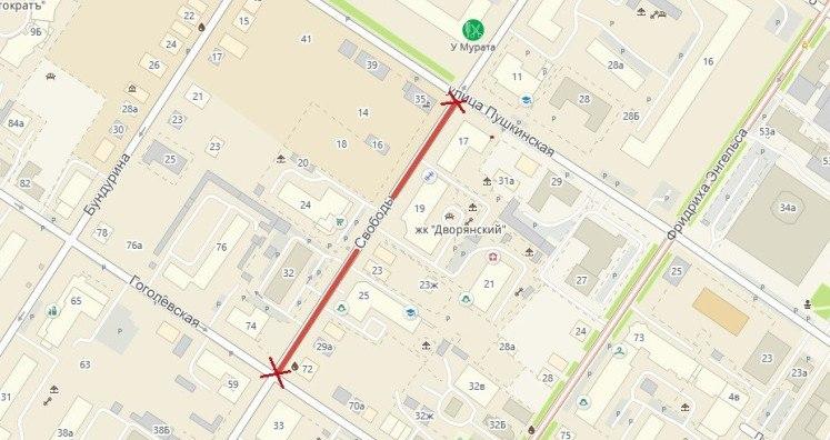 На схеме выделен участок улицы Свободы с перекрытием